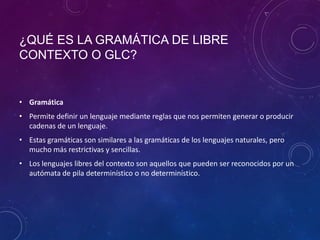 La gramática define las reglas de producción para generar cadenas válidas en lenguaje C. Define reglas para cabeceras de inclusión, funciones, tipos de variables, operadores básicos, cadenas de formato para entrada/salida, y más. Permite generar cadenas que representen código C válido como el ejemplo dado que incluye declaración de variables, entrada/salida, operaciones y retorno de función.