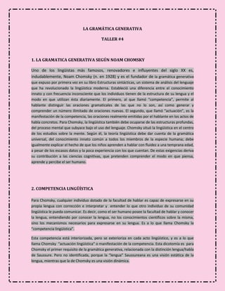 Este documento describe los principios fundamentales de la gramática generativa según Noam Chomsky. Chomsky estableció una distinción entre la competencia lingüística innata y la actuación. Propuso que el lenguaje se compone de estructuras profundas y superficiales relacionadas por reglas de transformación. La gramática generativa describe las reglas universales subyacentes que permiten a los hablantes generar y comprender un número infinito de oraciones.