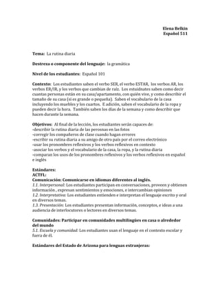La lección introduce los pronombres reflexivos y los verbos reflexivos a estudiantes de nivel básico de español. La lección incluye actividades como describir rutinas diarias, ver un video, completar oraciones con verbos reflexivos en una canción, y escribir una carta sobre la rutina diaria usando verbos reflexivos. El objetivo es que los estudiantes puedan usar nueve verbos reflexivos correctamente.