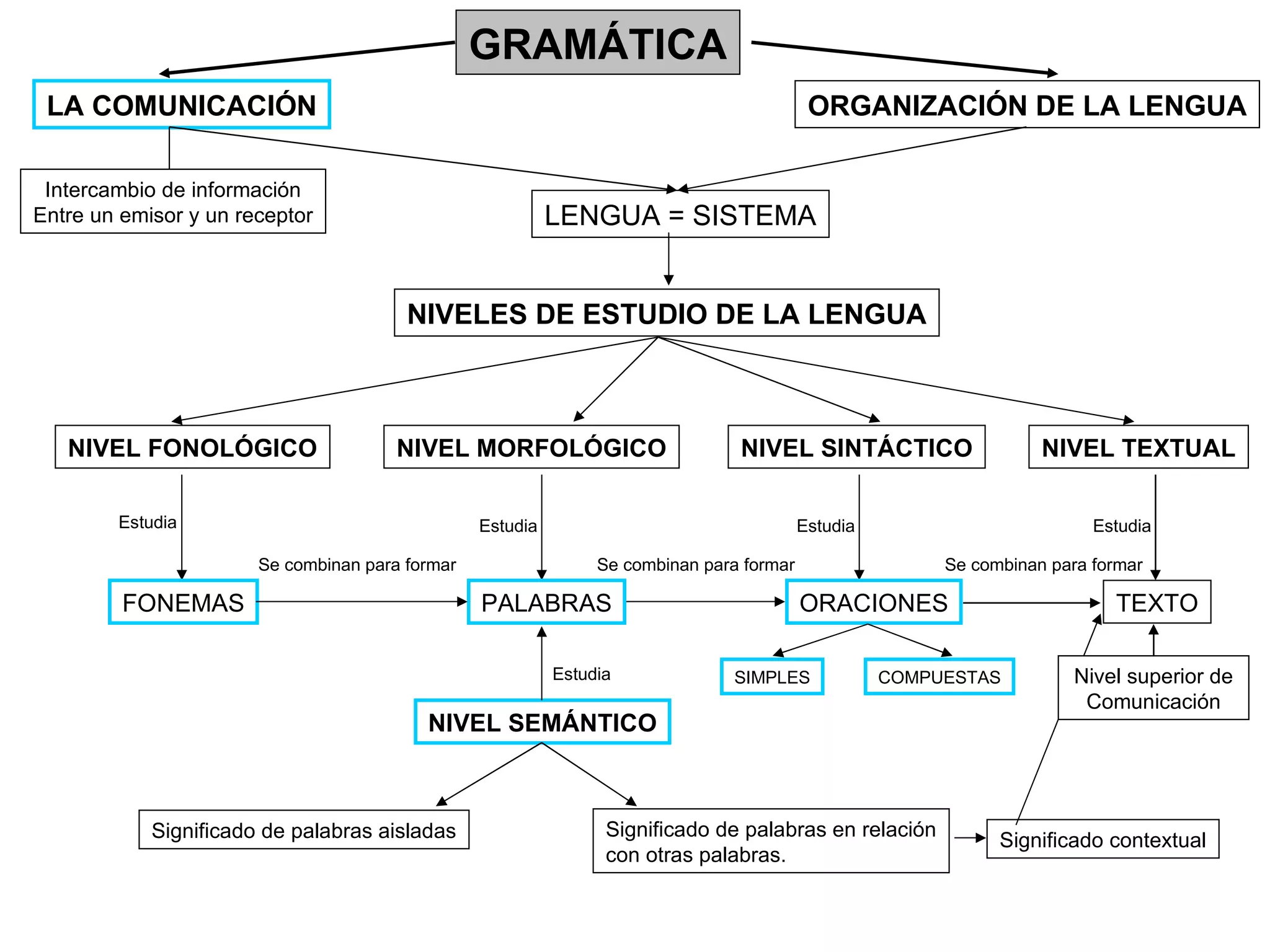 El documento describe los diferentes niveles de estudio de la lengua, incluyendo el fonológico, morfológico, sintáctico, semántico y textual. Explica que cada nivel estudia los diferentes elementos que se combinan para formar palabras, oraciones y texto. El nivel superior de comunicación es el intercambio de información entre un emisor y receptor.