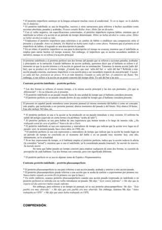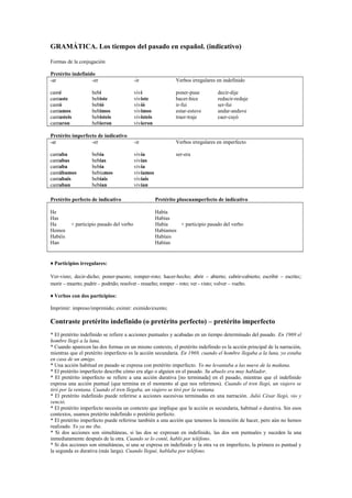 Este documento describe los tiempos del pasado en español, incluyendo el pretérito indefinido, el pretérito imperfecto, el pretérito perfecto y el pretérito pluscuamperfecto. Explica las formas de conjugación de cada tiempo, los verbos irregulares, y contrasta el uso y significado de cada tiempo pasado en diferentes contextos narrativos y oracionales.