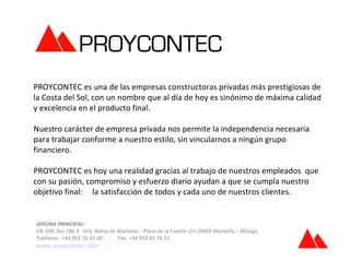 Proycontec es una destacada empresa constructora en la Costa del Sol, reconocida por su alta calidad y excelencia. Su independencia como empresa privada les permite trabajar según su propio estilo, priorizando la satisfacción del cliente. Actualmente, están trabajando en la promoción de 198 viviendas en Gran Calahonda.