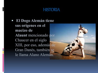 El dogo alemán, conocido también como gran danés, es un perro nacional de Alemania con orígenes en el macizo de alaunt. Aunque tiene un temperamento amigable y es conocido como el 'gigante gentil', puede enfrentar problemas de salud debido a su tamaño, como artritis y tumores óseos. Requiere cuidados regulares, como cepillado, para manejar su abundante pelaje.