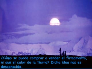 El jefe Seattle expresa en su carta al presidente de Estados Unidos que la tierra, los animales y todos los elementos de la naturaleza son sagrados para los indígenas americanos. Advierte que si los estadounidenses compran sus tierras deben recordar que son sagradas y enseñar eso a sus hijos, y deben tratar a los animales como hermanos. También expresa su temor de que el apetito de los estadounidenses destruya la tierra y deje solo un desierto.