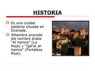 La Alhambra de Granada fue una ciudad palatina árabe construida en el siglo XIII. Se divide en tres zonas principales: administración, palaciega y de viviendas. Algunas de sus características arquitectónicas más destacadas son los Patios de los Arrayanes, de los Leones y las Salas de Dos Hermanas y de los Abencerrajes, conocidas por sus cúpulas de mocárabes. El Generalife era la finca agropecuaria asociada a la Alhambra.