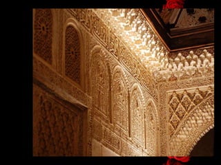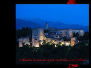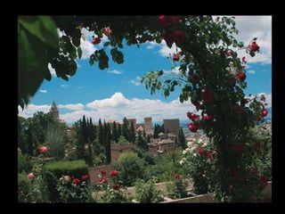 El documento describe la historia y características arquitectónicas de varios lugares importantes en Granada, como La Alhambra, la Catedral, y el barrio del Albaicín. Se construyó La Alhambra en 1238 como fortaleza y residencia real, y contiene lugares notables como el Patio de los Leones y el Generalife. La Catedral fue ordenada por los Reyes Católicos en 1503 y alberga sus tumbas. El barrio del Albaicín conserva la mezcla original de arquitectura ára