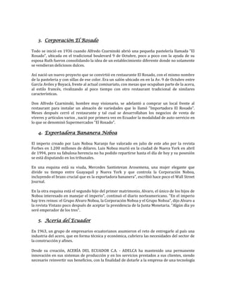 Este documento presenta 10 ejemplos de grandes empresas ecuatorianas, incluyendo Corporación La Favorita, PRONACA, Corporación El Rosado, Exportadora Bananera Noboa, Acería del Ecuador, DANEC S.A., Industrias ALES, Hidalgo e Hidalgo, Grupo Difare y NOVACERO. Resume la historia y operaciones clave de cada empresa.