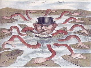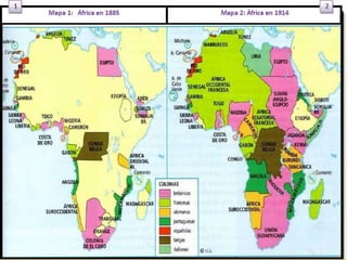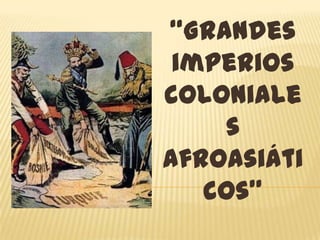 El documento resume la situación de los grandes imperios coloniales europeos en África y Asia a finales del siglo XIX. Menciona que potencias como Inglaterra, Francia, España, Portugal y Alemania establecieron colonias en África y Asia para obtener materias primas y mercados para sus productos industriales. También describe la Conferencia de Berlín de 1884-1885, donde estas potencias acordaron reglas para dividirse África y regular la competencia colonial. Finalmente, resume brevemente los enfoques del Imperio Británico y Franc
