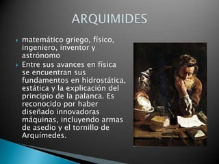 Este documento presenta breves biografías de importantes inventores e investigadores de la física como Arquímedes, Galileo Galilei, Isaac Newton, Thomas Edison y Albert Einstein. Resalta los principales logros científicos de cada uno como sus contribuciones a la hidrostática, estática, palanca, telescopio, gravitación universal, mecánica clásica, óptica, electricidad, fonógrafo, películas, teoría de la relatividad especial, equivalencia masa-energía y mecánica cuántica.