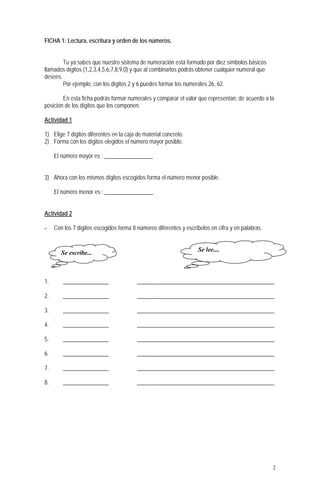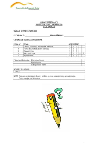 Este documento presenta una unidad didáctica sobre los grandes números para estudiantes de 5to básico. Consta de 5 fichas que abordan temas como la lectura, escritura y orden de los números, la forma desarrollada, equivalencias, valor posicional y aproximación. Cada ficha incluye actividades prácticas para que los estudiantes ejerciten y aprendan estos conceptos matemáticos fundamentales.