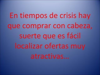 El documento ofrece consejos para encontrar buenas ofertas durante tiempos de crisis. Recomienda buscar ofertas atractivas pero tener cuidado con la publicidad engañosa o poco clara. También sugiere comprar varios artículos juntos para ahorrar y considerar detalles como idioma, tamaño y calidad que afectan el precio.