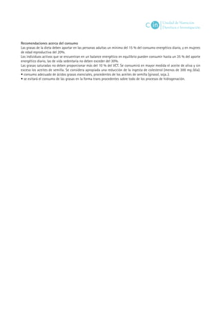 Este documento describe las grasas, incluyendo sus funciones, clasificación, fuentes y recomendaciones de consumo. Las grasas tienen funciones energéticas, estructurales y de transporte de vitaminas. Se clasifican en lípidos simples, compuestos y derivados. Las principales fuentes de grasas saturadas son la mantequilla, quesos, carnes, huevos y aceites vegetales. Se recomienda que las grasas aporten entre el 15-35% de la ingesta calórica diaria y que las grasas saturadas no superen el 10% de