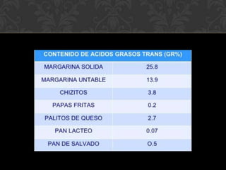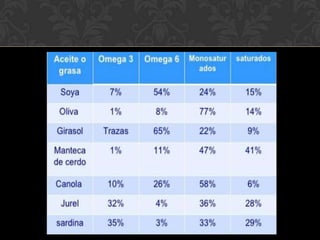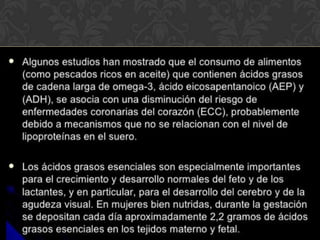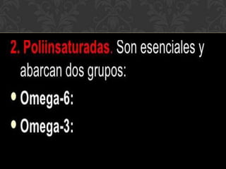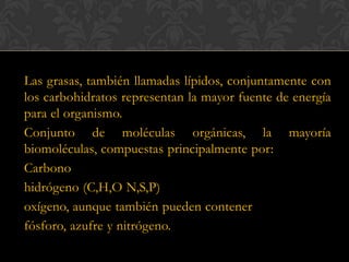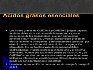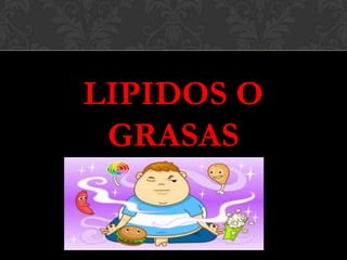 Este documento proporciona información sobre los lípidos o grasas. Explica que los lípidos son una fuente importante de energía y cumplen funciones estructurales, de almacenamiento de energía y reguladoras. Se clasifican los lípidos y se describen los ácidos grasos saturados e insaturados, incluyendo sus fuentes alimenticias y efectos en la salud. También cubre los ácidos grasos omega 3 y 6, y recomienda las ingestas diarias ideales de estos nutrientes.