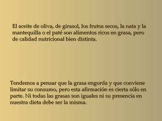 Este documento trata sobre los diferentes tipos de grasas y su importancia nutricional. Brevemente describe que: 1) Las grasas se clasifican en saturadas, monoinsaturadas y poliinsaturadas; 2) Cada tipo tiene efectos distintos en la salud, siendo las monoinsaturadas y poliinsaturadas más saludables; 3) Es importante incluir grasas en la dieta pero en las proporciones adecuadas.