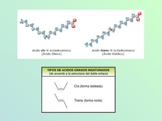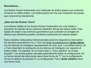 El documento describe las diferencias entre las grasas cis y trans. Las grasas cis son las naturales y saludables, mientras que las grasas trans se producen industrialmente y son perjudiciales para la salud, aumentando el riesgo de enfermedades cardíacas y diabetes. Las principales fuentes de grasas trans son los aceites vegetales hidrogenados, la fritura a altas temperaturas, y la grasa de animales rumiantes.