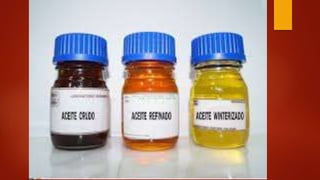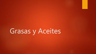 El documento define las grasas y aceites alimenticios y describe sus principales componentes y clasificaciones. Explica que las grasas son una mezcla de triacilglicéridos y otros lípidos que cumplen funciones energéticas y estructurales. Describe los métodos de análisis bromatológico para evaluar las características físicas, químicas y de pureza de los aceites comestibles de acuerdo con los reglamentos aplicables.