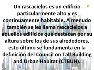 Los rascacielos más altos del mundo incluyen el Burj Dubai en Dubái (649 metros), el Taipei 101 en Taiwán (509 metros) y el Shanghai World Financial Center (492 metros). Otros rascacielos notables son las Torres Petronas en Kuala Lumpur (427 metros) y la Torre Sears en Chicago (527 metros). El Empire State Building en Nueva York (381 metros) fue durante mucho tiempo el rascacielos más alto del mundo.