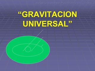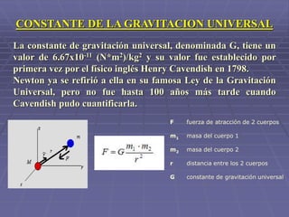 La constante de gravitación universal, g, tiene un valor de 6.67x10-11 (n*m2)/kg2 y fue cuantificada por Henry Cavendish en 1798. Se presenta la ley de gravitación de Newton, la energía potencial gravitacional y las leyes de Kepler que describen el movimiento de los planetas. Se incluyen ejemplos prácticos sobre el peso de objetos en diferentes cuerpos celestes y cálculos relacionados con la aceleración gravitacional y la velocidad de escape.