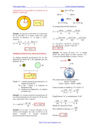 Este documento describe la ley de gravitación universal de Newton, la cual establece que todas las masas en el universo se atraen entre sí con una fuerza directamente proporcional al producto de sus masas e inversamente proporcional al cuadrado de la distancia que las separa. También explica conceptos como la aceleración de la gravedad, la energía potencial gravitatoria y las leyes de Kepler que rigen el movimiento planetario. Finalmente, propone 11 problemas relacionados con estos temas para resolver.