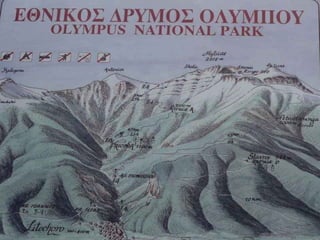 El documento describe una excursión de 8 días y medio horas a través de las rocas sagradas de Meteora y los monasterios allí, el desfiladero del río Enipeas y sus monasterios, y una ascensión al monte Olimpo, la montaña mítica de los griegos, incluyendo descripciones e imágenes de paisajes, cimas, refugios y capillas encontrados a lo largo del viaje.