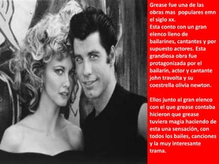 Grease fue una de las obras musicales más populares del siglo XX protagonizada por John Travolta y Olivia Newton-John. La historia se centraba en una pareja de estudiantes de secundaria en los años 50 y contó con un gran elenco de bailarines, cantantes y actores. La química entre los protagonistas y las canciones pegadizas hicieron de Grease un éxito que definió una era.