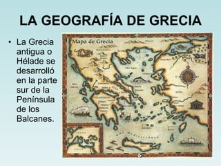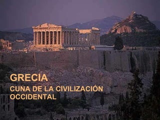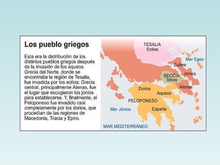 El documento resume la historia de la civilización griega antigua. Los griegos se asentaron inicialmente en la península balcánica y las islas del mar Egeo, donde desarrollaron las primeras civilizaciones como la minoica en Creta. Más tarde surgieron las ciudades-estado o polis, como Atenas y Esparta, que establecieron la democracia y otras formas de gobierno. Los griegos también expandieron su cultura a través de la colonización del Mediterráneo. Lucharon contra los persas en las Guerras
