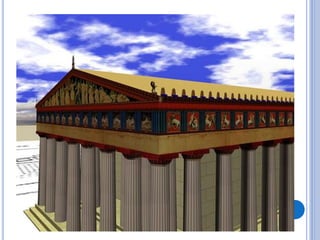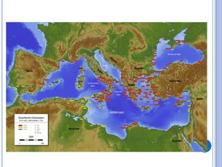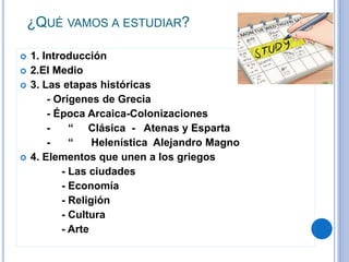 El documento resume la civilización griega antigua, desde sus orígenes hasta su expansión bajo Alejandro Magno. Aborda las principales etapas históricas, los elementos que unían a los griegos como las polis, economía, religión y cultura, y los logros de su arte, literatura, filosofía y ciencia que sentaron las bases de la civilización occidental.