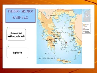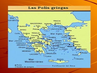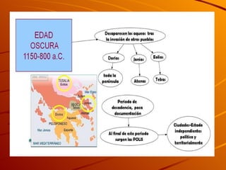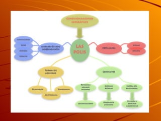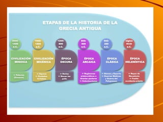 El documento describe la civilización de la Antigua Grecia desde el 1100 a.C. hasta el 146 a.C. Aborda su influencia en Occidente, su cronología que incluye la Edad Oscura, el periodo Arcaico, Clásico y Helenístico, sus polis o ciudades-estado, las Guerras Médicas y aspectos de su estructura social, educación, economía, filosofía, literatura, cultura, ciencia, tecnología, arte, religión y mitología.