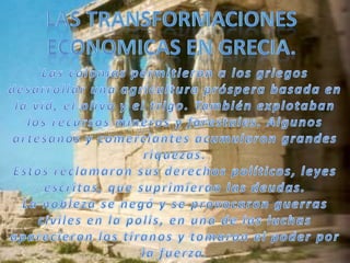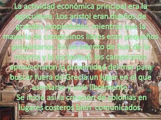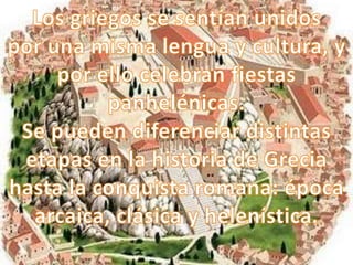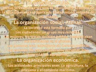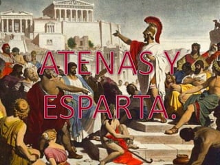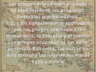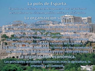 El documento describe las civilizaciones prehelénicas como la cretense y la micénica, así como la organización política de las polis griegas de Atenas y Esparta durante la antigua Grecia. La sociedad micénica estaba organizada en tribus gobernadas por reyes, con una aristocracia guerrera dominante sobre campesinos, artesanos y esclavos. Más tarde, las ciudades-estado griegas como Atenas y Esparta se organizaron de forma independiente con sus propios sistemas de gobierno.
