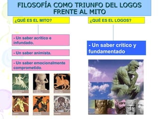 Este documento resume la filosofía griega desde sus orígenes hasta Aristóteles. Comienza explicando el surgimiento de la filosofía a partir del mito y el logos. Luego describe a los primeros filósofos presocráticos y sus teorías sobre la physis. Finalmente, analiza las contribuciones de los sofistas, Sócrates, Platón y Aristóteles a temas como la teoría de las ideas, el conocimiento, el alma, la ética y la política.