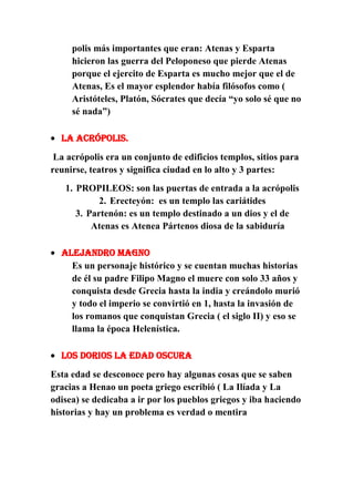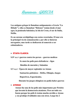 Grecia estaba formada por una serie de ciudades-estado independientes llamadas polis. En los siglos V y IV a.C., las polis más importantes eran Atenas y Esparta. Atenas floreció bajo la democracia y el liderazgo de Pericles, mientras que Esparta era un estado militarizado. Los antiguos griegos destacaron en filosofía, arquitectura, escultura y otras artes. Celebraron los Juegos Olímpicos cada cuatro años para honrar a los dioses.