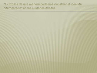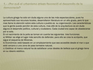 La cultura griega influyó enormemente en el Imperio Romano y en Europa. Los griegos tuvieron logros fundamentales en lengua, política, educación, filosofía, ciencia y artes que influyeron en el Renacimiento y movimientos neoclásicos. La Acrópolis de Atenas albergaba importantes monumentos griegos como el Partenón, Erecteión y Propileos, y fue el centro religioso, político y cultural más importante de la antigua Grecia.