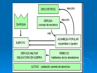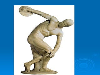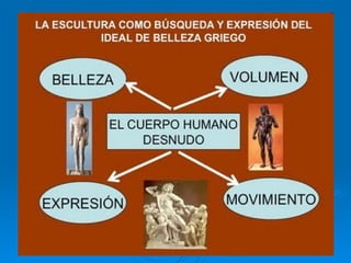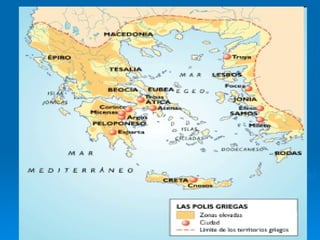 El documento describe varios aspectos de la antigua Grecia. Habla sobre las polis griegas que eran estados independientes con su propio gobierno y leyes. También describe la acrópolis, el teatro, los juegos olímpicos, la filosofía, la religión y los dioses griegos, la mitología, el arte, y más.