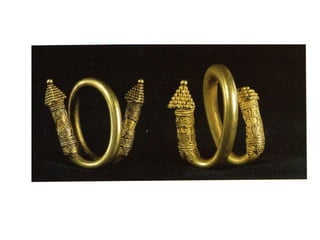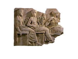 El documento describe el arte clásico griego. Señala que los griegos fundaron colonias que transmitieron su cultura y arte. El arte griego se caracteriza por el humanismo, la búsqueda de la belleza ideal y la proporción. La arquitectura griega incluye templos y espacios públicos construidos con columnas de los órdenes dórico, jónico y corintio. La escultura griega evolucionó desde formas rígidas y frontales hacia representaciones naturalistas del cuerpo humano. Las obras maestras incluyen escult