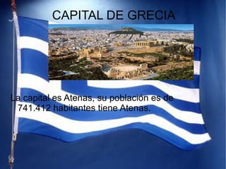 La capital de Grecia es Atenas, que tiene una población de 741.412 habitantes. Grecia está situada en el sureste de Europa, tiene una densidad de 82,5 personas por km2 y una población total de 10.760.140. Es una república parlamentaria conocida como la República Helénica, cuyo himno se llama "Libertad o muerte" y la comida típica es la Pikilia.