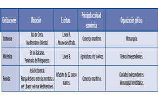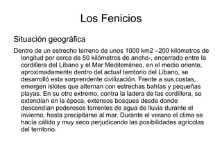 Los fenicios se desarrollaron en una estrecha franja de tierra entre el Monte Líbano y el Mar Mediterráneo, donde se vieron obligados a concentrarse en el comercio marítimo debido a las limitaciones agrícolas. Construyeron una economía basada en la navegación, los puertos y el comercio internacional de manufacturas. Los hebreos se asentaron al sur de Fenicia en la región de Palestina, entre el Mar Mediterráneo, el Río Jordán, el Mar Muerto y las montañas del Líb