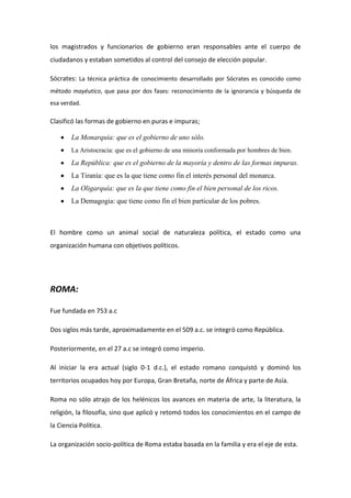 Grecia y Roma fueron importantes civilizaciones antiguas. Grecia estuvo fragmentada en numerosas ciudades-estado independientes como Atenas y Esparta. Roma comenzó como monarquía y luego se transformó en una poderosa república y posteriormente en un imperio que dominó gran parte de Europa y el norte de África. Ambas civilizaciones desarrollaron formas innovadoras de gobierno como la democracia ateniense y el sistema político de la república romana.