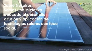 El documento presenta una charla de Leandro Magri en Green Drinks en junio de 2014 sobre energía solar y tecnologías autofabricables. Magri destaca la necesidad de hacer más para promover estas tecnologías y proporciona su contacto para aquellos interesados en aprender más.