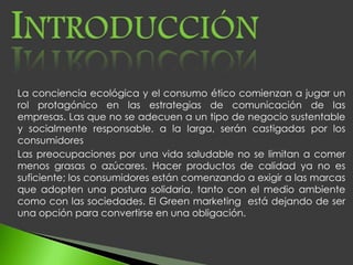 El documento discute el creciente papel del marketing verde y la responsabilidad social en las estrategias de las empresas. Explica que los consumidores ahora exigen que las marcas adopten posturas solidarias con el medio ambiente y la sociedad. También analiza si las campañas de marketing verde realmente generan conciencia ambiental entre los consumidores y por qué las grandes empresas se han interesado en el marketing verde.