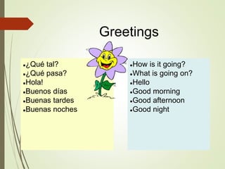 Este documento presenta saludos y despedidas formales e informales en español e inglés. Incluye frases comunes para saludar, presentarse, despedirse y responder preguntas básicas sobre el nombre, edad y origen de una persona. También cubre cómo presentar a amigos de manera formal e informal.