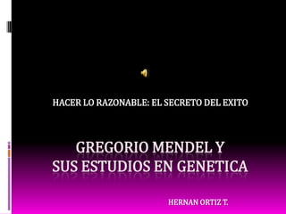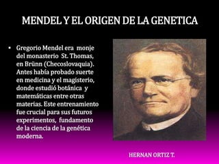 Gregorio Mendel realizó experimentos pioneros sobre la herencia genética usando guisantes. Estudió 7 rasgos de las plantas de guisante y realizó cruces monohíbridos. Encontró que los rasgos se heredan de forma predecible según las leyes que propuso. Sus cuidadosos métodos experimentales, análisis estadístico de los resultados y elección del guisante como organismo de estudio le permitieron establecer las bases de la genética moderna.