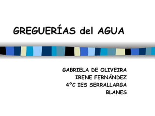 El documento presenta varias greguerías o metáforas breves sobre el agua. Compara un grifo mal cerrado con ojos desconsolados, describe el surf como un baile, y la nieve como azúcar disuelta en agua. También establece comparaciones entre un grifo y un centinela, y entre el mar y un espejo del cielo. El documento proporciona las fuentes de las imágenes.