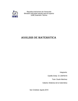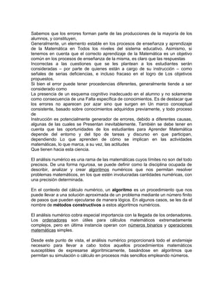 El documento habla sobre el análisis de errores comunes en el aprendizaje de matemáticas. Explica que los errores forman parte natural del proceso de enseñanza y aprendizaje y surgen de esquemas cognitivos inadecuados, no solo de falta de conocimientos. También destaca que el contexto y tipo de tareas influyen en lo que los estudiantes aprenden.