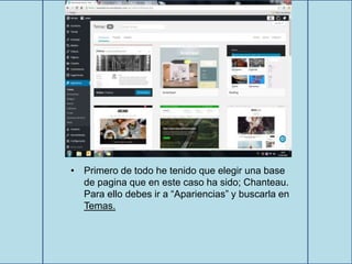 Este documento proporciona instrucciones en 6 pasos para personalizar una página web utilizando el tema Chanteau en WordPress. Los pasos incluyen seleccionar un tema, agregar un título y subtítulo, cambiar colores y fuentes, agregar imágenes de cabecera, crear un menú y cambiar la apariencia general. El objetivo es crear una página personalizada siguiendo estos pasos de configuración.