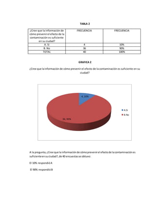 El documento presenta los resultados de una encuesta realizada a 40 personas sobre temas relacionados con la contaminación ambiental y la ciencia, tecnología y sociedad. Más del 90% de los encuestados considera que la contaminación ambiental es un problema actual y el 90% cree que la información sobre cómo prevenir sus efectos no es suficiente en su ciudad. Todos apoyan las jornadas de limpieza en sus hogares y casi todos (97%) consideran que dar buen manejo a los desechos contribuye a la preservación ambiental. La mayoría (70%) concibe el en
