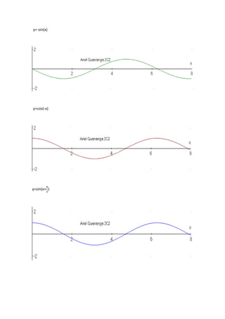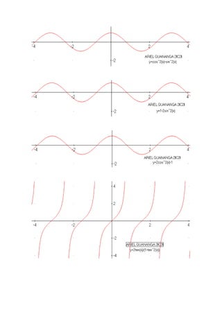 Este documento lista diferentes funciones trigonométricas y sus gráficas, incluyendo sen(x), cos(x), tan(x), sec(x), csc(x) y sus variaciones. También incluye funciones compuestas como sen(x)cos(nx) para diferentes valores de n, así como secciones sobre funciones de ángulos dobles, mitad y múltiples.