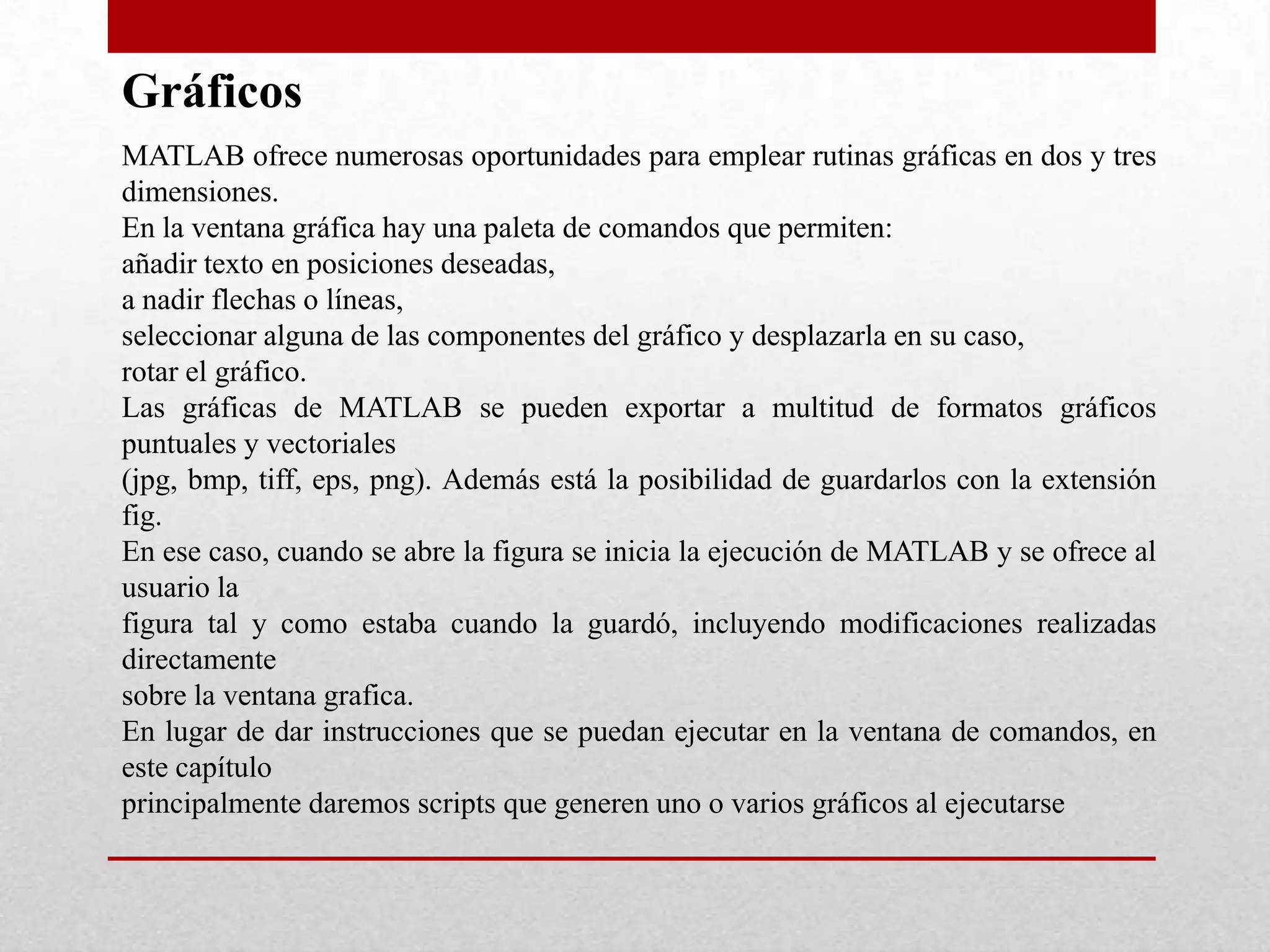 Este documento proporciona una introducción a la creación de gráficos en MATLAB. Explica cómo generar gráficos bidimensionales y tridimensionales, incluidas curvas, superficies, curvas de nivel y más. También describe cómo personalizar gráficos con opciones de color, etiquetado y manipulación interactiva.