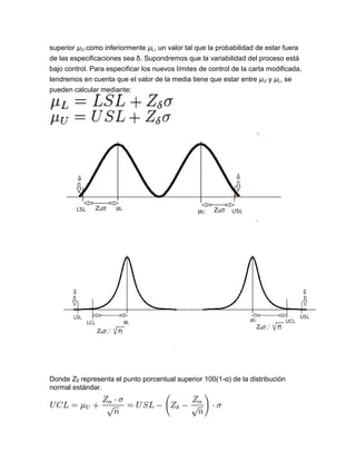 Este documento describe los gráficos de control y límites de control modificados. Los gráficos de control se utilizan para analizar procesos industriales mediante métodos estadísticos y prever posibles fallas. Cuando la capacidad de un proceso es alta, se recomiendan límites de control modificados. Estos límites permiten cierta variación en la media siempre que no produzca piezas defectuosas por encima de un umbral δ. Los nuevos límites se calculan en función de la variabilidad del proceso y un nivel de