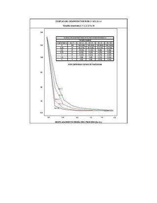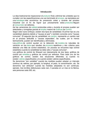 El documento describe diferentes tipos de gráficos de control utilizados para monitorear procesos industriales. Explica gráficos de control para variables como x-R, x-s y x-rm, los cuales monitorean la variabilidad en promedios y rangos/desviaciones estándar. También describe gráficos de control para atributos como p, np, c y u, los cuales cuentan defectos y unidades defectuosas para monitorear calidad. El documento provee detalles sobre cómo construir cada tipo de gráfico de control, incl