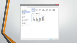 Este documento explica cómo insertar y modificar gráficos en Microsoft Word. Describe gráficos como representaciones visuales que comunican conceptos usando figuras y texto corto. Explica que para insertar un gráfico, debes seleccionar la opción "Insertar" y "Grupo Ilustraciones" y elegir el tipo de gráfico, lo que abrirá una ventana de Excel para ingresar los datos numéricos que se representarán en el gráfico de Word. Además, indica que puedes modificar el estilo, color y apariencia del gr